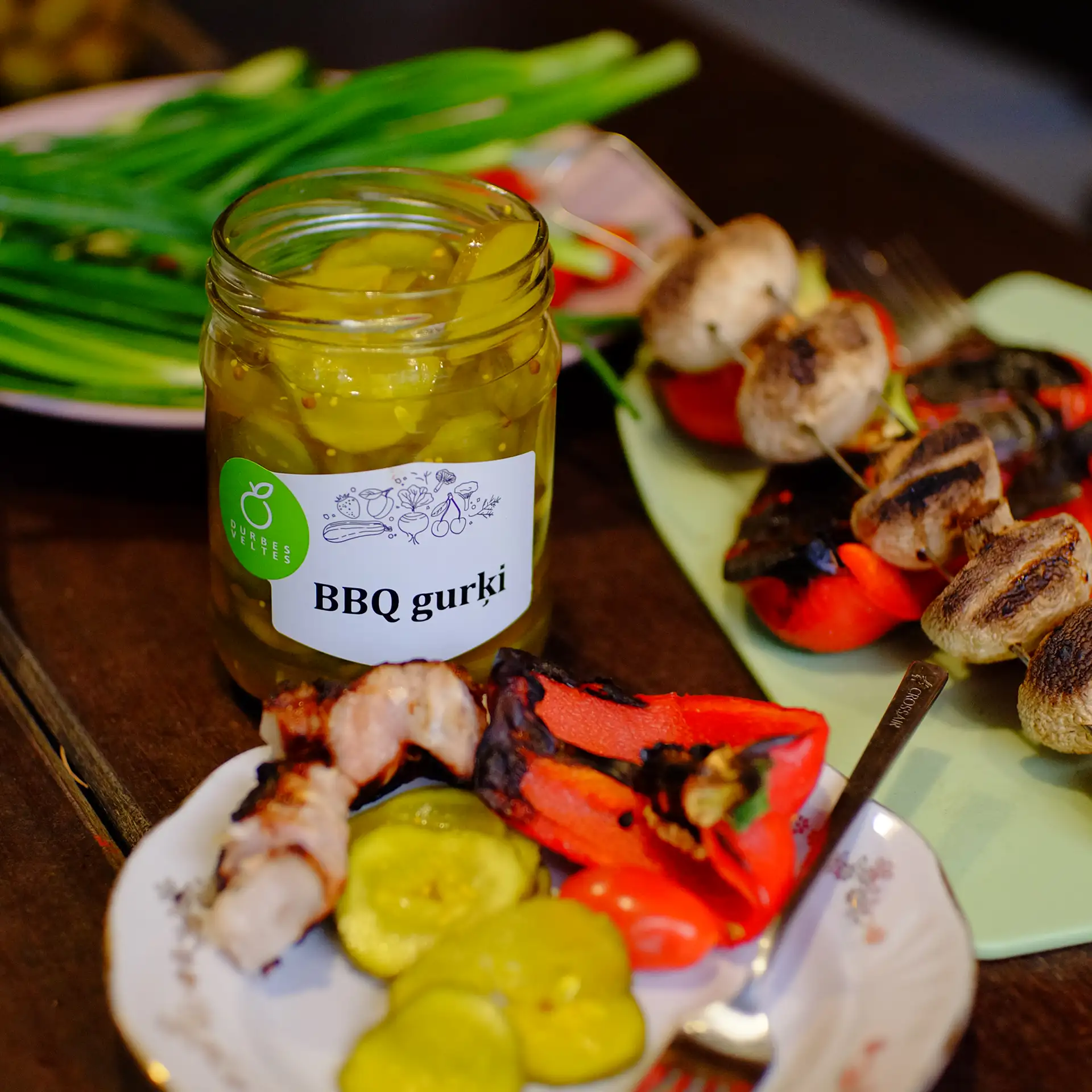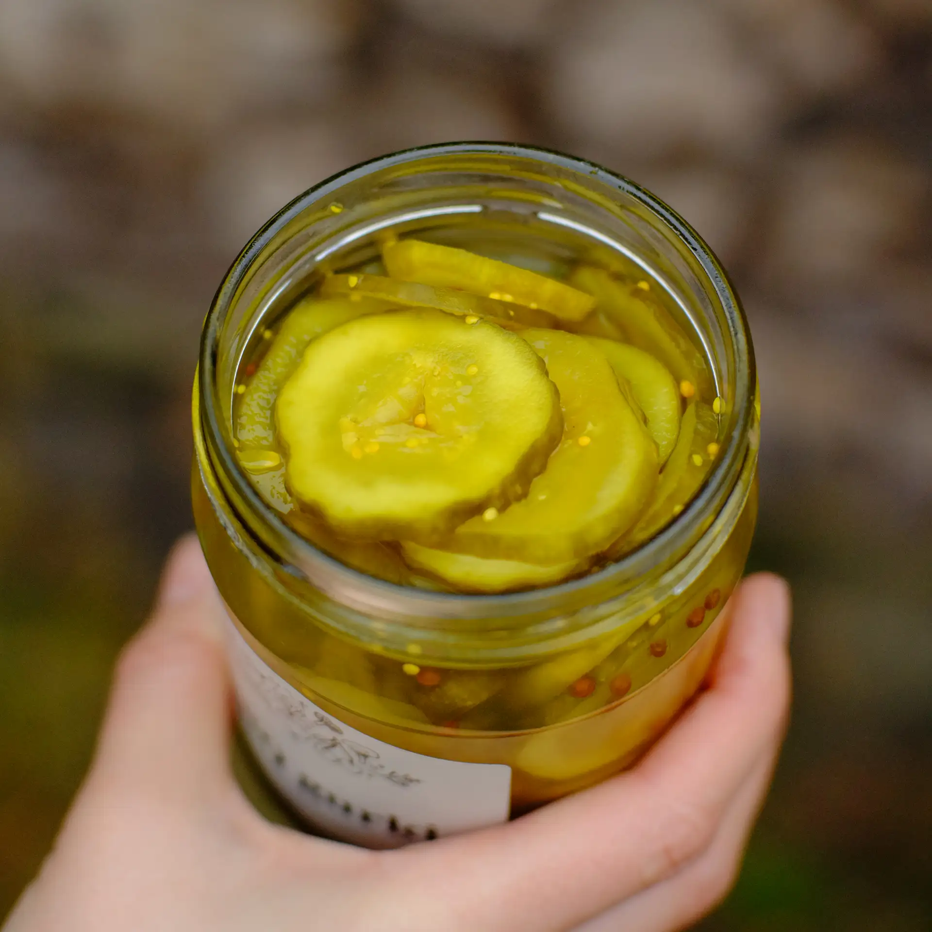 Sagriezti marinēti gurķi vidēja stipruma etiķa marinādē ar ķiplokiem, sinepju sēklām, koriandra sēklām, kurkumu.